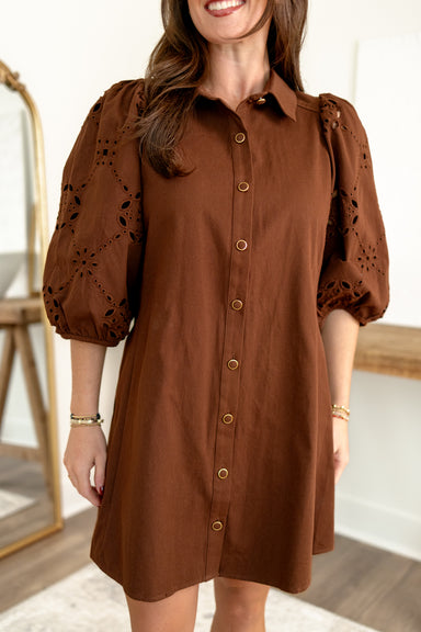 Fresh and feminine, the Marty Dress features solid eyelet fabric with ¾ puff sleeves, a classic shirt collar, and a button-front closure. Lightwei...
