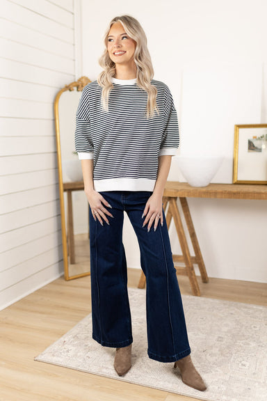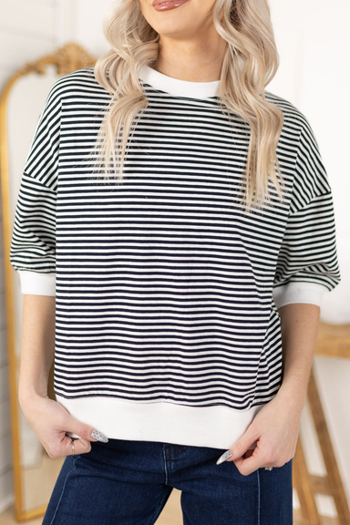 Model is 5’4 wearing a size small Striped fabric Contrast trim Banded hem