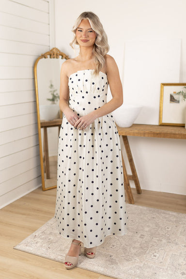 Model is 5’4 wearing a size small Polka dot print Strapless Pleated bodice Fitted waist Full skirt Invisible back zip closure Fully lined