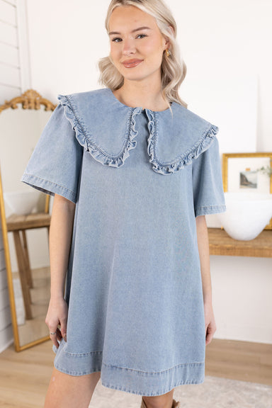 Denim fabric Short sleeves Peter pan collar Ruffle details Side pockets