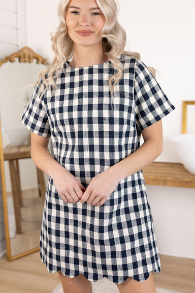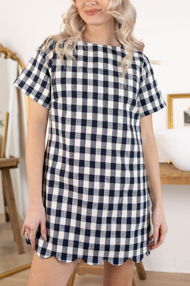 Plaid fabric Short sleeves Scallop hem Back button closure Tailored fit Lined