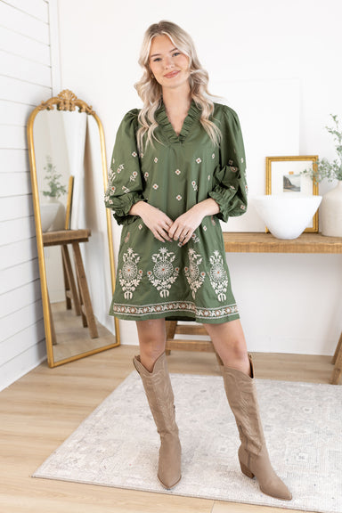 Floral embroidery details 3/4 puff sleeves V-neckline with ruffle trim Side pockets Elasticated sleeve opening Lined Non-sheer Lightweight