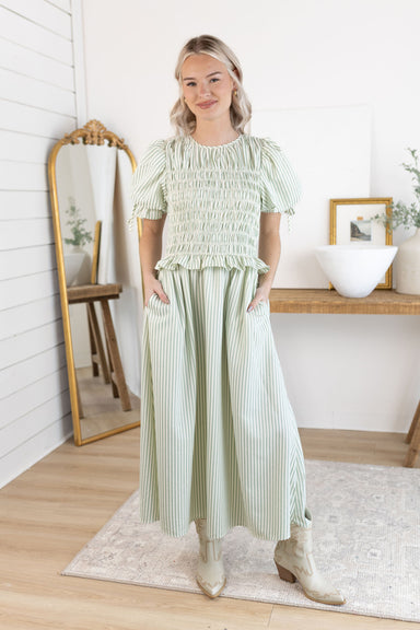 Short puff sleeves Midi length Striped fabric Smocked bodice Flared skirt Round neckline