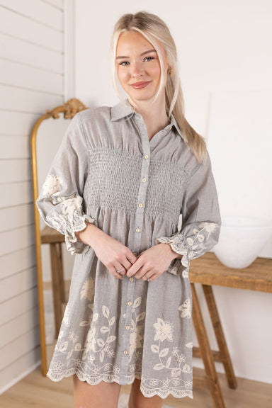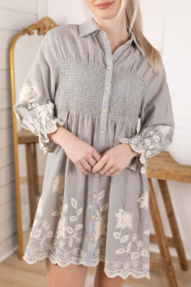 Intricate embroidery details Striped fabric Smocked details Front button closure Classic collar Scallop hem