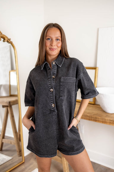 Get ready to rock and roll in this Broadway Denim Romper! Made from washed grey denim, this romper features short sleeves for a cool and casual loo...