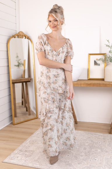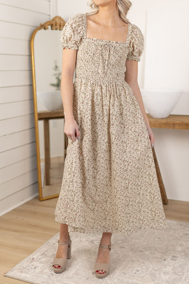 Model is 5’4 wearing a size small Smocked bodice Puff sleeves Flowy fit Tiered skirt Maxi length