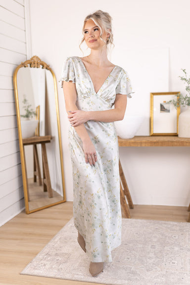 Model is 5’4 wearing a size small Soft floral print Silky, satin fabric Plunging v-neckline Flutter sleeves Timeless silhouette