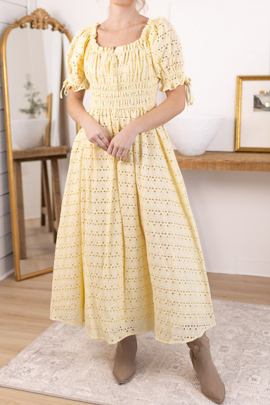 Model is 5’4 wearing a size small Eyelet lace Smocked bodice Puff sleeves Tie details Square neckline Maxi length