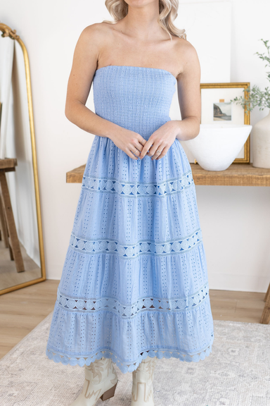 Strapless design Stretchy smocked bodice Tiered skirt Intricate eyelet lace panels Flowy silhouette Lightweight cotton blend