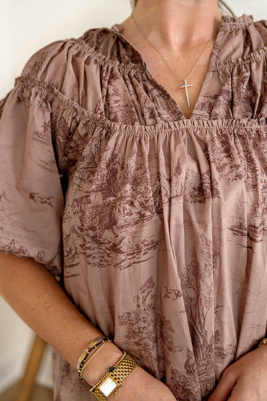 View full detailsFeminine and classic, the Toile Blouse features a timeless toile print with delicate ruffle accents and puff sleeves. Shirring details add a soft,...