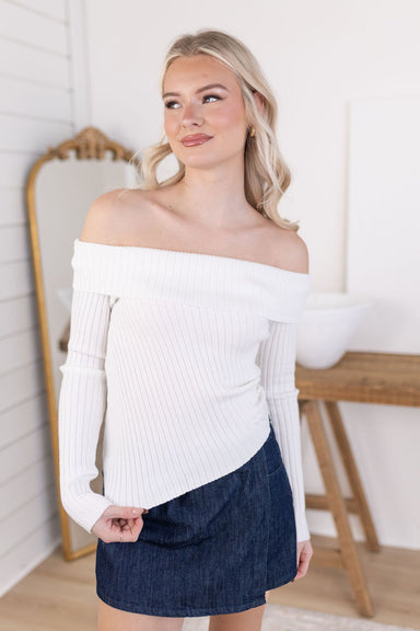 Asymmetrical hem Off-shoulder Ribbed knit Side slits Foldover neckline