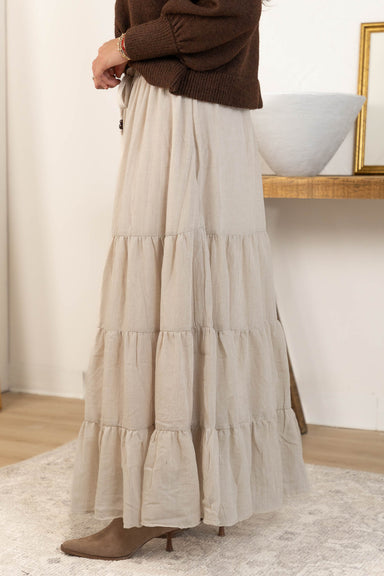 Elevate your wardrobe with the Rowan Maxi Skirt, featuring a graceful tiered design that adds dimension and movement. Model is 5'4 wearing a...