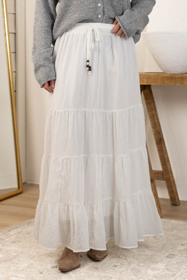 Elevate your wardrobe with the Rowan Maxi Skirt, featuring a graceful tiered design that adds dimension and movement. Model is 5'4 wearing ...