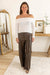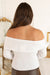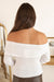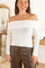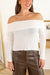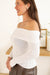 The Eliza Ribbed Sweater features a stylish off-shoulder design that effortlessly adds a touch of sophistication to your outfit.